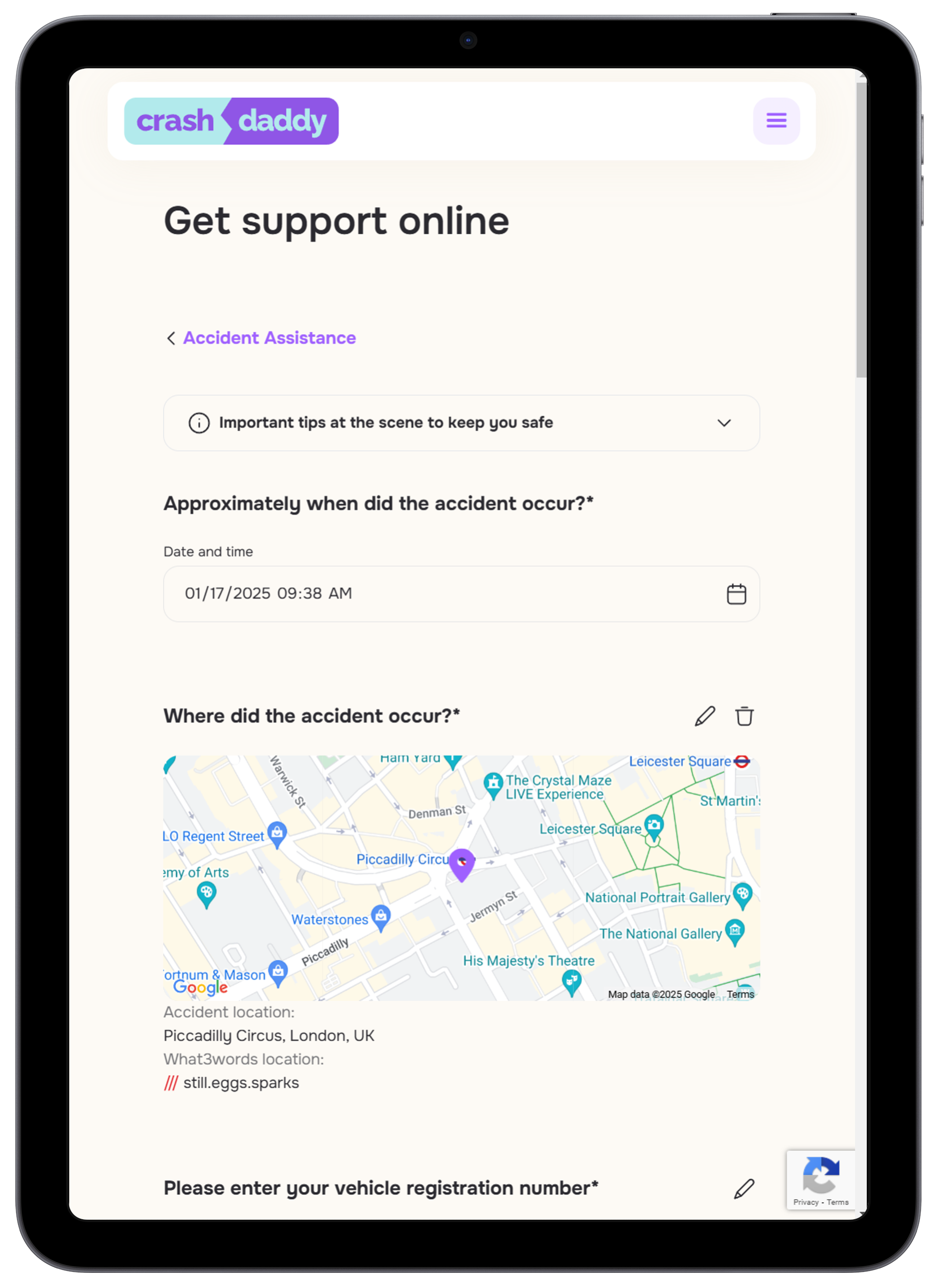 If you're at the side of the road and dont know what to do next, follow our guide here (i.e. widget with a guide), or call us to ensure you collect the right info.